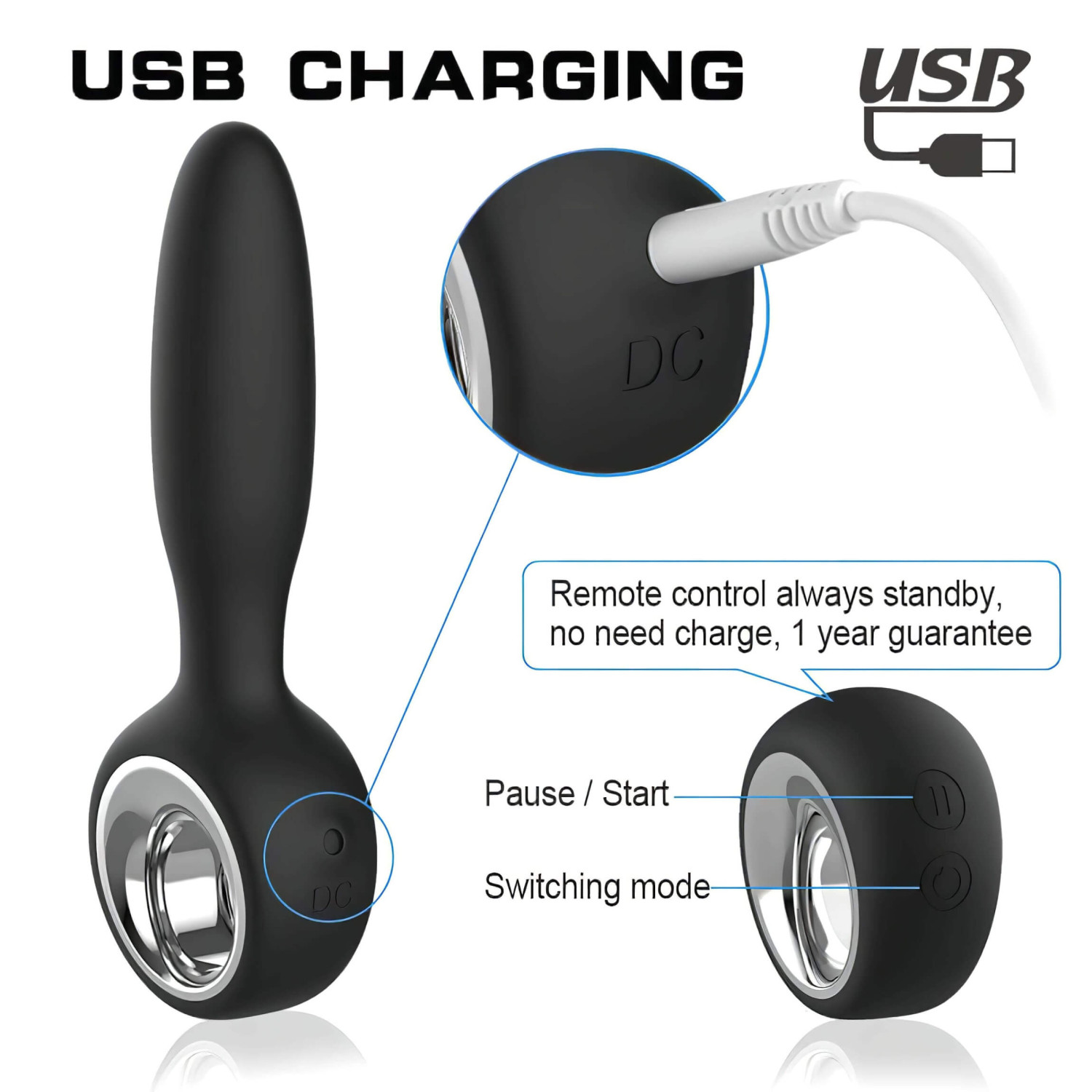 Na úchyte je jedno tlačidlo. Keď ho dlhšie podržíš, pomôcka sa zapne a rozsvieti sa malá LED-ka. Od tohto momentu už vieš prepínať režimy aj diaľkovým ovládačom. Krátkym stlačením tlačidla postupuješ dopredu vibračnými režimami. Ak podržíš tlačidlo dlhšie, vibrátor sa úplne vypne a LEDka zhasne.